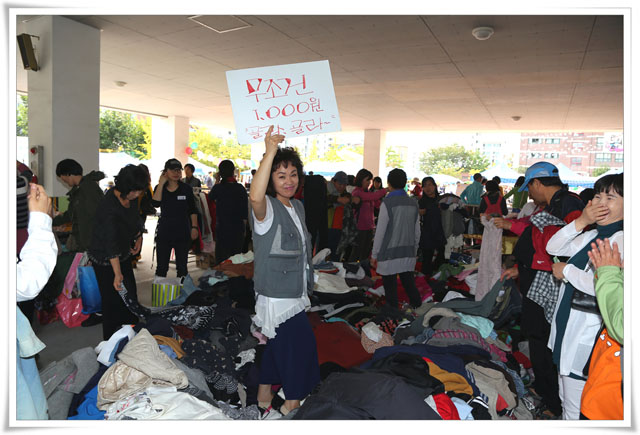 나비장터 전체를 책임진 일산정토회 도반들이 옷과 책, 주방용품, 학용품 등을 진열하고 판매했고 춘천법당은 가방과 모자, 구두, 액세서리를 맡았습니다. 오전 10시부터 오후 3시 경까지 남대문 시장을 방불케 하는 활기와 열기 속에 엄청나게 많은 물건들이 새 주인을 찾아갔습니다. 물건 값은 천 원 아니면 이천 원이어서 사는 사람은 횡재한 것처럼 즐거워했고 파는 사람도 덩달아 기뻤습니다. 판매 수익이 새터민 정착 지원금으로 쓰인다고 하니 모두 행복한 거래였지요.