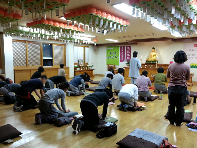 부총무님의 안내말씀을 듣고 삼귀의와 반야심경 봉독 후 시작한 천배정진! 밤 12시 되니 겨우 500배를 했습니다. 무릎이 좋지 않아 시간 내 천배를 할 수 없다는 것은 이미 알고 있지만 오늘은 그 속도가 더 더디기만 합니다. 하지만 500배라도 할 수 있는 다리의 소중함을 알고 있기에 이렇게 절을 할 수 있는 내 다리가 고맙기만 합니다.
