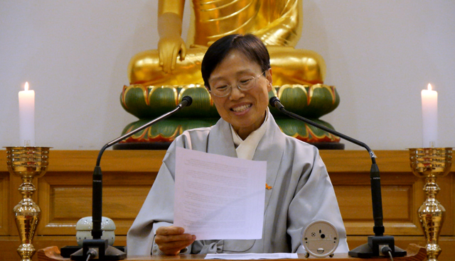 “일 년 동안 계속 해 오신 분도 계시고, 오늘이 인수인계자리가 되신 분도 있겠는데요, 어떤 경우에도 정토행자의 기본은 본인의 수행입니다. 본인의 수행이란, 자기의 행복은 자기가 책임지는 겁니다. 내가 행복하지 않은 것은 내가 한 생각 사로잡혀서 그런 거고, 내 행복은 내가 만드는 것이지, 누가 행복하게 해줄 수 있는 게 아니다, 이것이 명확해야 수행자입니다. 정토행자로서의 관점을 가지는 것이 희망리포터의 기본입니다. 그 기본이 충실하면 다른 어떤 역할도 해낼 수 있습니다. 누구든지 배워가면서 하면 되거든요. 옛날보다 훨씬 물어가면서 할 수 있는 게 쉬워졌어요. 온라인 세상이잖아요. 이렇게 일 년에 한두 번 오프라인에서 만나도 정보를 충분히 교류할 수 있는 좋은 세상에 있습니다. 물어서 하고 나누고 하다 보면, 내 경험이 요만큼밖에 안 되는데 여러 사람들의 경험이 나에게 힘이 되어 줄 수 있는 그런 세상에 살고 있습니다.
