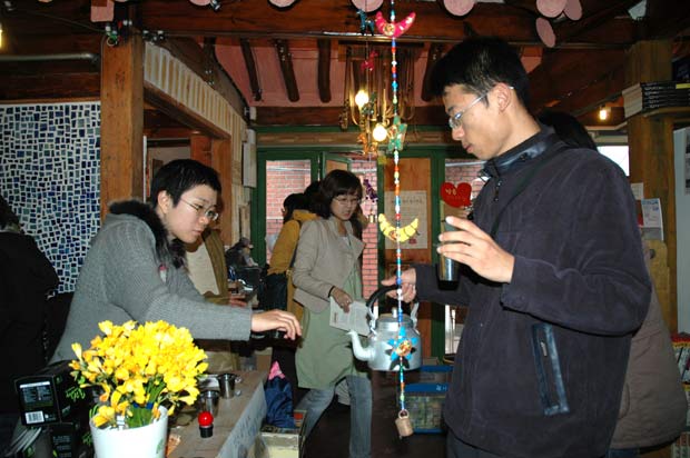 전시회를 준비한 대학생들과 특별한 짜이집을 위해 달려 갔을 김진환 법우님이 짜이 한잔부터 하라며 분주히 차를 준비합니다.