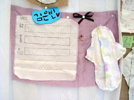 마리중학교 1학년 아이들의 전시물. 마리학교는 중등교육과정을 가르치는 기숙형 대안학교로 현재 50여명의 아이들이 공동체 생활을 하며 공부하고 있다. 이곳에서는 '페미니즘' 수업이 있어 자신이 쓸 생리대를 직접 만들어 보며 섬유와 유통과정, 바느질, 환경에 대한 교육을 통합적으로 한다.