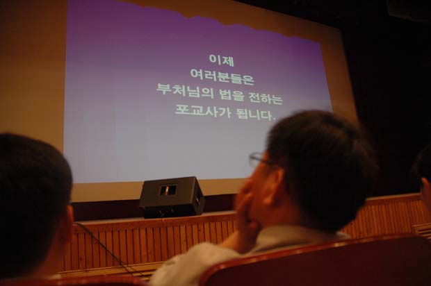 입재식 장소가 극장식이다 보니 오체투지를 할수가 업었습니다. 그래서 다들 서서 삼배를 했습니다. 특히 이번 입재식에서는 대학생 정토회의 김석범 법우님의 다큐가 상영되었습니다. 입재 법문에서도 영상물에서 보았듯이 참 행복은 그렇게 자신의 변화에서 시작하라는 말씀을 하셨습니다. |