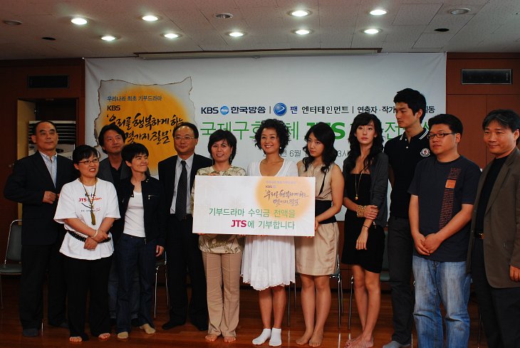 ▲ 8개월간의 제작비용을 뺀 수익금은 연기자 대표 배종옥씨가 박지나 JTS 해외사업본부장에게 전달했습니다. 이 금액은 북한, 인도, 필리핀 등의 어린이들을 위한 먹을거리, 치료, 배움의 목적으로 사용될 예정입니다.