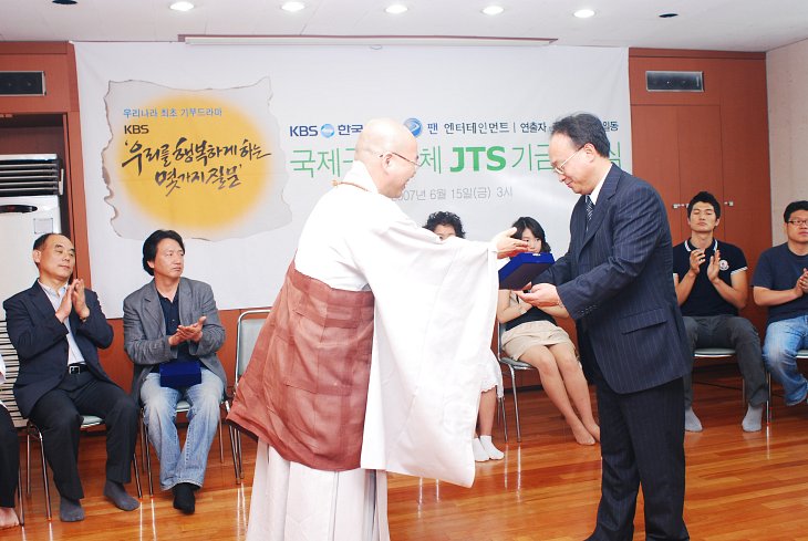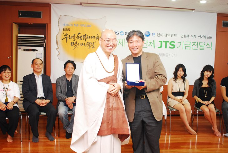 ▲ 제작에 동참했던 팬엔터테인먼트 김종식 사장이 JTS 이사장 법륜스님께 감사패를 전달 받고 있습니다.